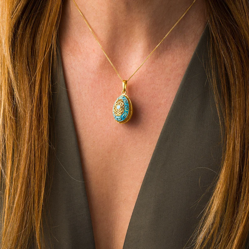 Meander Filigree Egg Pendant Necklace with Enamel in Sterling Silver Gold Plated, Faberge egg pendant, Greek jewelry, Easter Gift